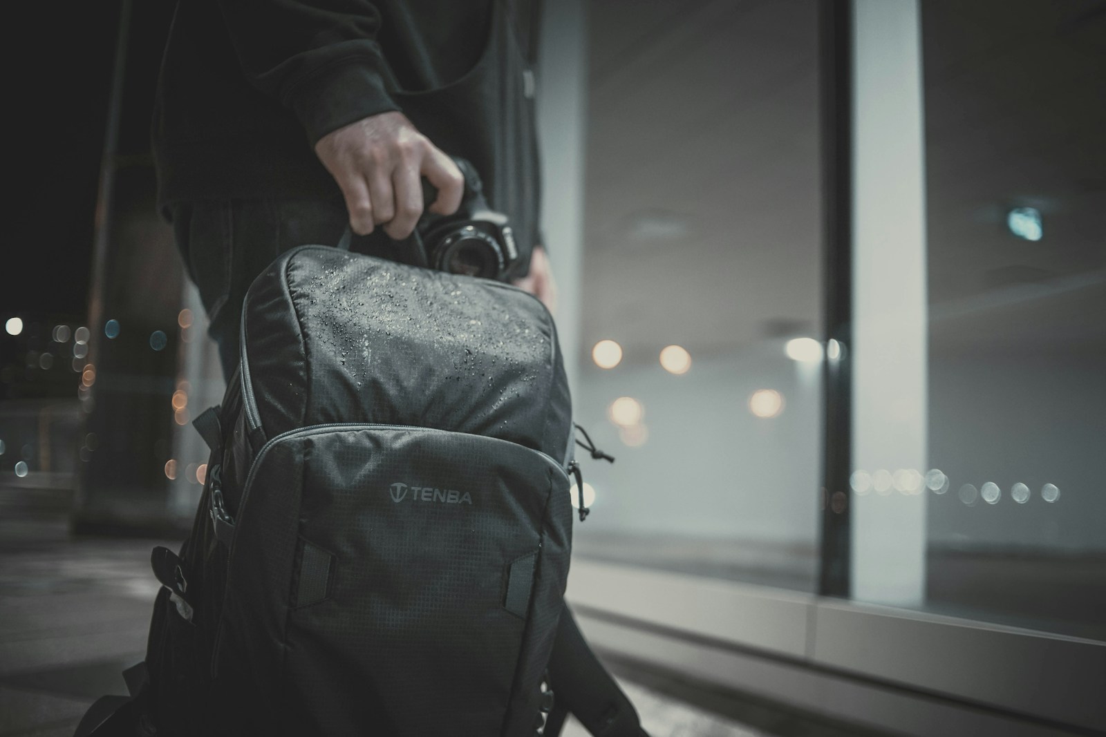 un homme portant un sac à dos noir et un appareil photo